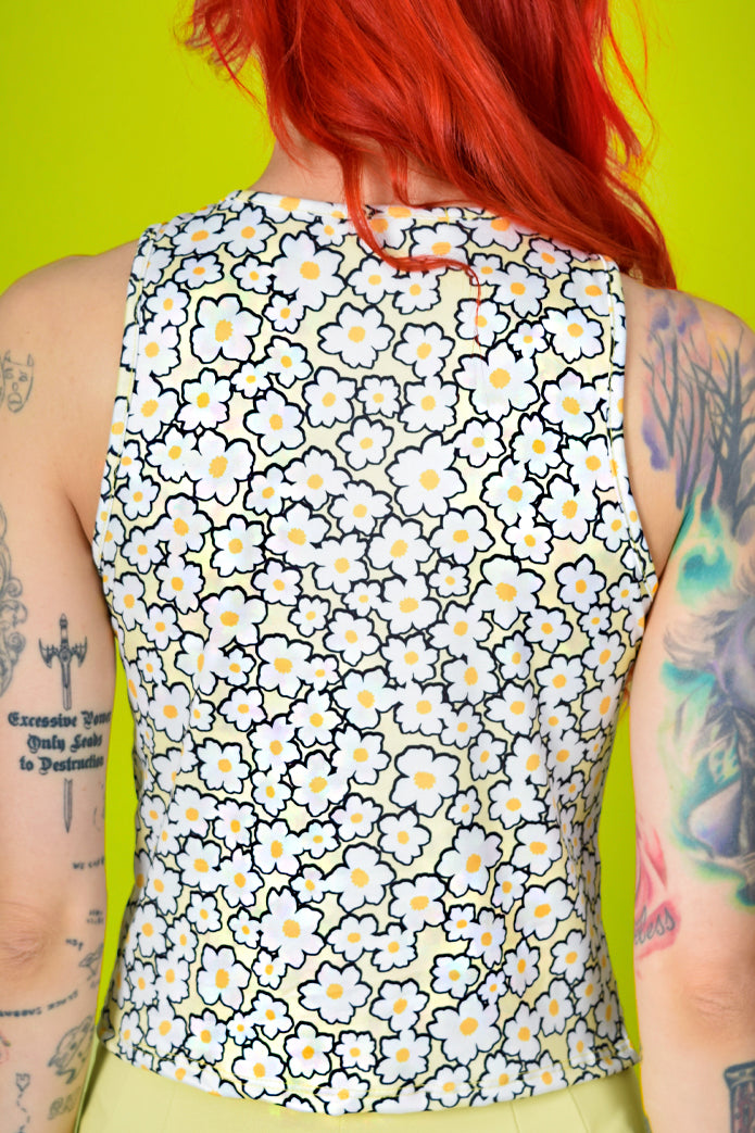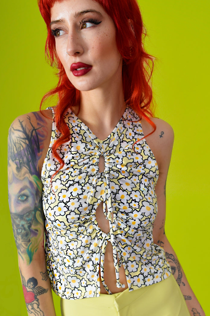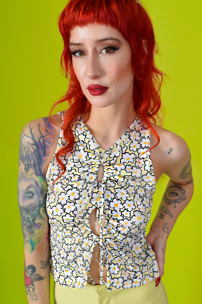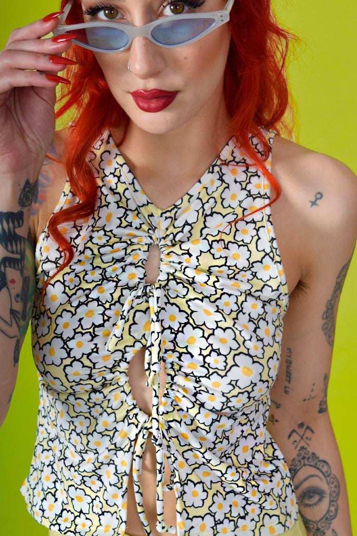 Bright, bold, & cute as hell 70s via 90s inspired Tie Front Top! Pair with some cute colored capris and platform sandals for a beyond cute look!