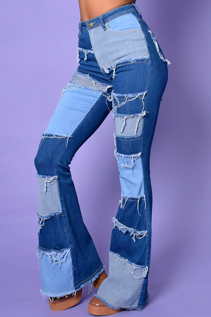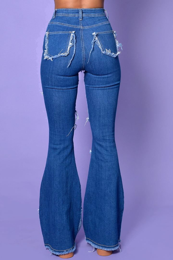 FABRIC: STRETCH – HIGH RISE WITH ZIPPER FLY – FLARE JEANS SIZE + FIT – FRONT RISE: 10 1/2 – INSEAM: 34.5″