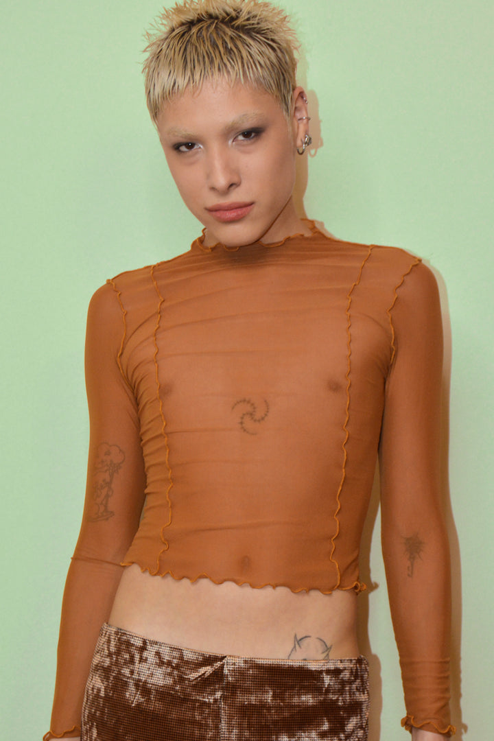 Super cute mesh mock neck top with reversed stitching detail. Perfect for layering!