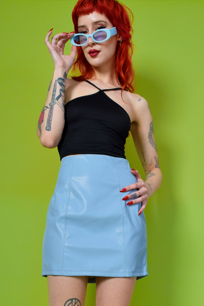 Love this easy to pair pleather skirt! Features a high-rise waist, princess seams, mini length, and back zipper closure.