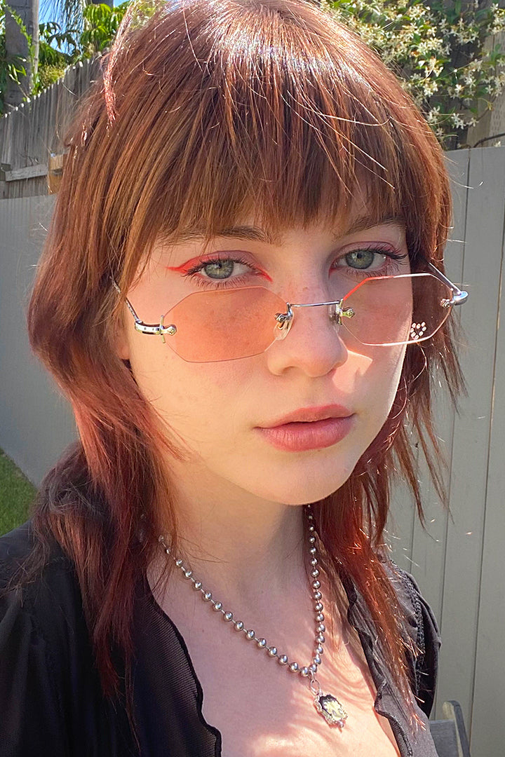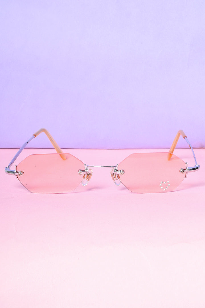 Rimless rectangle sunglasses featuring a pink lens and a jewel heart. Britney Spears approved.Â