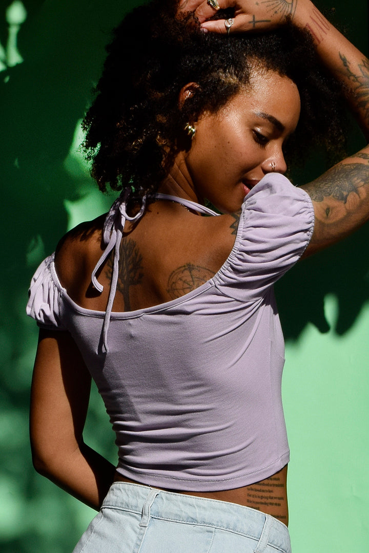 Super cute and unique style top featuring a tie back halter and a front tie bow!
